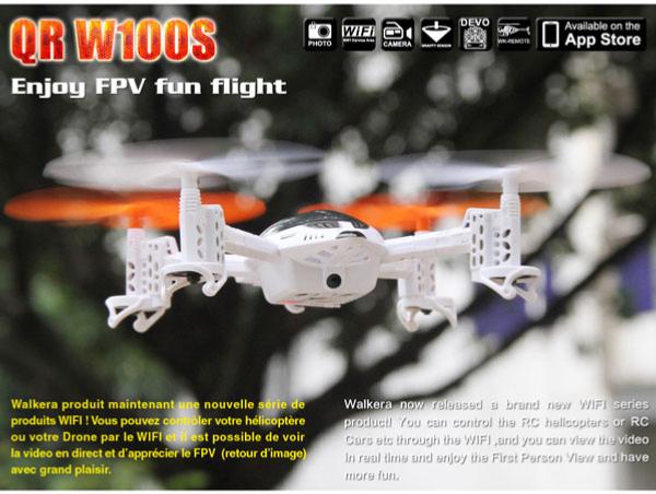 La société WALKERA leader dans le concept des Drones modèles réduits a ajouté une puce Wi-Fi à son QR W100S permettant une utilisation simple et rapide du Wi-Fi avec votre smart phone et rendant inutile toute connexion avec un routeur à l’intérieur de la maison. Le pilotage par le smart phone est très ludique et vous pouvez incliner le smart phone et utiliser le centre de gravité, le Drone prendra la même direction que celles enjointes par le déplacement de votre smart phone.