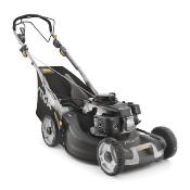Tondeuse à gazon autotractée équipée d'un moteur thermique de 163 cm³ et de 4 systèmes de coupe : ramassage, mulching, éjection latérale et éjection arrière de l'herbe.